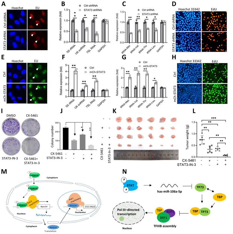 1. STAT3调节Pol IPol III指导的基因转录和癌细胞增殖。A) HepG2细胞EU染色结果显示STAT3沉默减少核仁中rRNA的表达;B,C)RT-qPCR结果显示STAT3沉默降低Pol III 产物的表达;D) EdU结果显示STAT3沉默抑制HepG2细胞增殖。E) HepG2细胞EU染色结果表明STAT3过表达增加核仁中rRNA的表达;F,G)RT-qPCR结果显示STAT3过表达促进Pol III 产物的表达。D) EdU结果显示STAT3过表达增加HepG2细胞增殖。I, J) STAT3 抑制剂和Pol I抑制剂对细胞克隆形成的影响。K, L) STAT3抑制剂和Pol I抑制剂对裸鼠成瘤的影响。M) STAT3 调节Pol I 转录的机制模型;N) STAT3调节Pol III 转录的机制模型。*, P<0 .05; **, P<0 .01; ***P<0 .001.