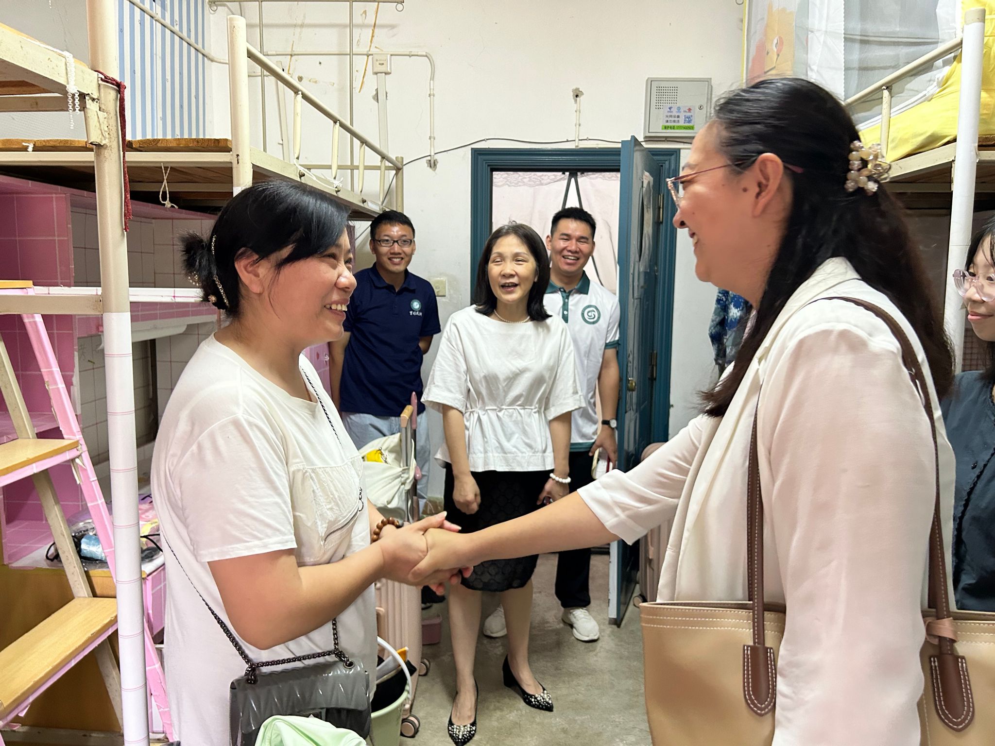 王婧带领我院领导逐一走访新生宿舍,仔细查看宿舍内卫生状况、安全设施及生活设施配备情况,确保每位新生都能在安全、舒适的环境中开始他们的大学生活。同时,王婧还表示希望学生们重视寝室环境,以饱满的精神投入到新学期的生活与学习中。
